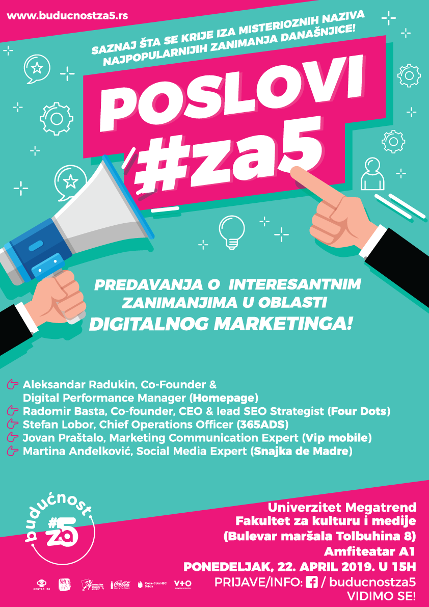 U ponedeljak, 22.aprila, sa pocetkom u 15sati, amfiteatar A1, univerzitetskog zdanja Megatrenda, u Marsala Tolbuhina 8, odrzace se predavanje o interesantnim zanimanjima u oblasti digitalnog marketinga – ulaz slobodan