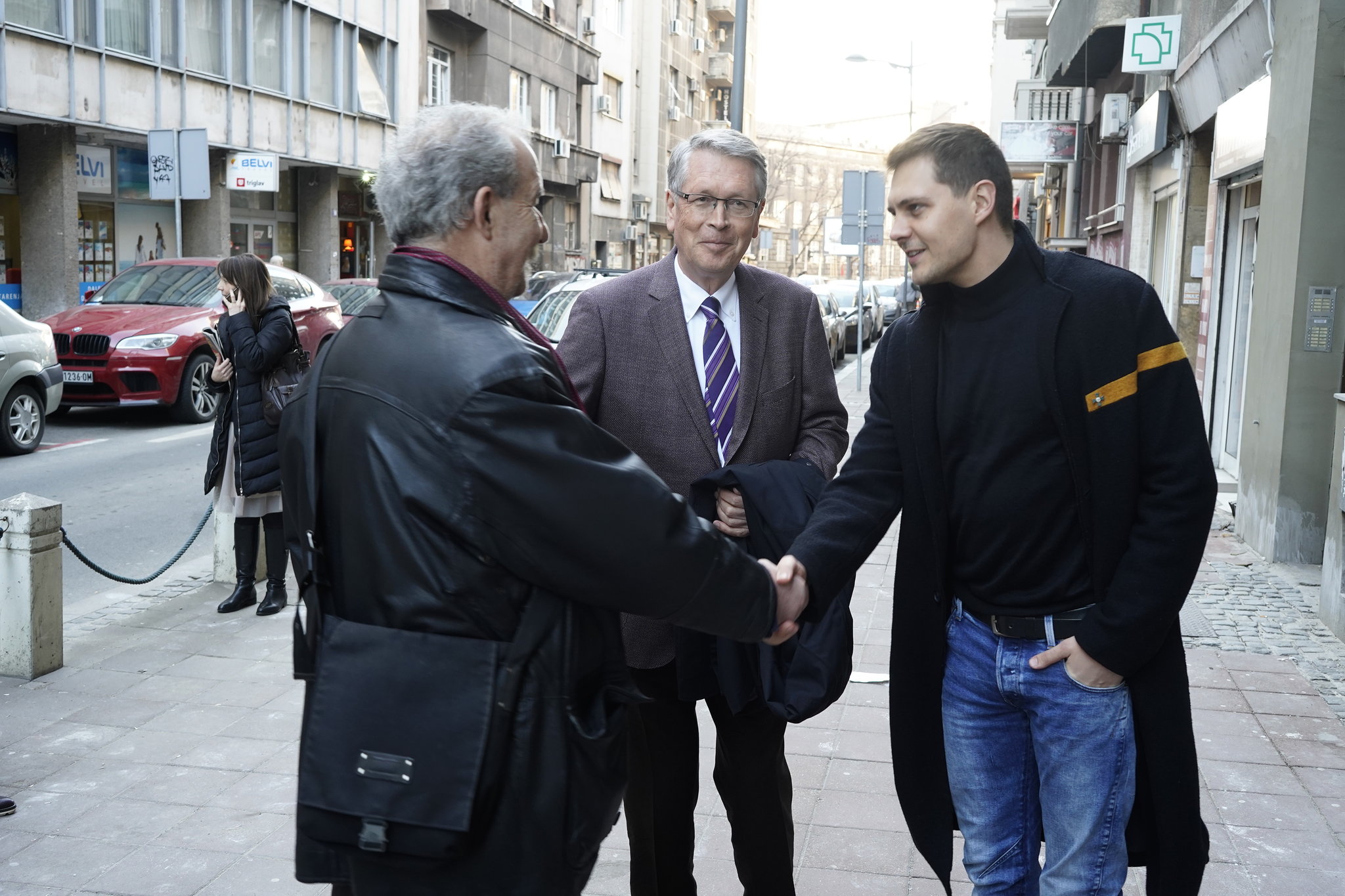 Profesor dr Budimir Potočan, ambasador Rusije Aleksandar Čepurin i dramski umetnik Miloš Biković uoči premijere filma ispred dvorane Kinoteke (Snimio Željko Sinobad)